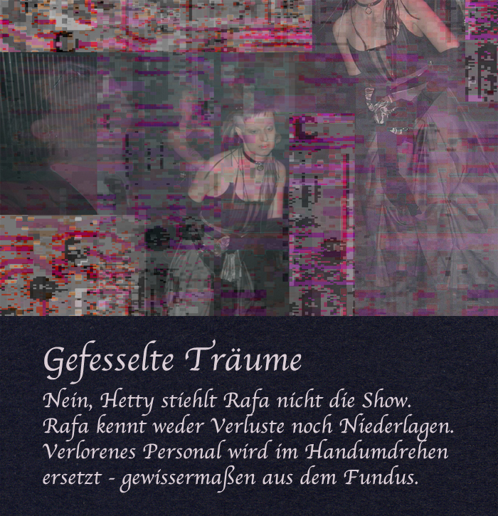 Rafa hat Berenice durch ein Mädchen ersetzt, das wie sie lange blondierte Haare hat. Vom Typ her wirkt es weicher als Berenice. Das Mädchen mußte hinter einer Leinwand auf übereinandergestellte Bier- und Colakisten steigen; es sollte während der Show durch die Leinwand als Schatten zu sehen sein. Es zog die Pumps aus, um nicht zu stolpern. Rafa probierte lange mit dem Mädchen und den Getränkekisten herum, dennoch blieb es ein wackliger Aufbau. Rafa entschied sich am Ende für eine Lösung ohne Getränkekisten.