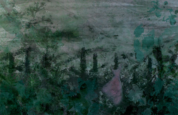 Hinter Birkenwäldern gab es verlassene Torfstichbecken, zwischen denen schmale, brüchige Pfade hindurchführten. Tanha betrachtete sein Spiegelbild im Wasser; da sah er, wie es sich veränderte, und es erschien eine Gestalt in einem rosenfarbenen Gewand, die sagte: